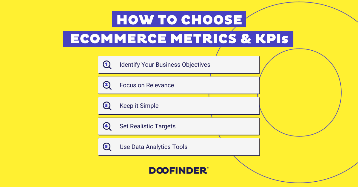 All articles Doofinder > Blog > Ecommerce Abigail Bosze • Reading time 9 min 03/18/2025 75 Top eCommerce KPIs and Metrics to Track in 2024 Abigail Bosze 9 min 03/18/2025 CONTENTS + CONTENTS Welcome to our comprehensive guide on eCommerce KPIs and metrics! In today’s competitive online landscape, tracking the right key performance indicators (KPIs) and metrics is vital for the success of your eCommerce business. Let’s dive in and explore what these terms mean and how they can boost your online store’s performance in 2024. What are eCommerce Metrics? eCommerce metrics are quantitative data points that provide valuable insights into the performance of your online store. They help you understand various aspects of your business, such as customer behavior, website traffic, sales, and marketing effectiveness. By tracking these metrics regularly, you can make data-driven decisions to optimize your eCommerce strategies. What are eCommerce KPIs? KPIs, or Key Performance Indicators, are specific and measurable metrics that indicate how effectively your eCommerce business is achieving its key objectives. Unlike general metrics, KPIs are tightly linked to your business goals and reflect its overall health and success. By setting and monitoring KPIs, you can focus on the most critical aspects of your business and track progress toward your desired outcomes. What’s the Difference Between a Metric and an eCommerce KPI? The main difference lies in their significance and purpose. While all KPIs are metrics, not all metrics are KPIs. Metrics provide data on various operational aspects, whereas KPIs are carefully selected metrics that directly align with your eCommerce business goals. Metrics give you a comprehensive view, while KPIs highlight specific areas of success or areas that need improvement. Types of eCommerce Metrics 1. Sales Metrics Sales metrics are crucial for assessing the effectiveness of your eCommerce business’s sales strategies and understanding the revenue generation process. By tracking these metrics, you gain insights into customer behavior and sales performance, allowing you to make data-driven decisions to boost revenue. Examples of Sales Metrics: Total Sales: The total monetary value of all products or services sold within a specific period. This metric provides an overview of your business’s overall performance. Conversion Rate: The percentage of website visitors who complete a desired action, such as making a purchase. A high conversion rate indicates successful sales funnels and optimized customer experiences. Customer Lifetime Value (CLV): The projected net profit that a customer will generate throughout their entire relationship with your business. CLV helps you understand the long-term value of acquiring and retaining customers. 2. Marketing Metrics Marketing metrics focus on analyzing the performance of your marketing efforts and their impact on attracting, engaging, and retaining customers. These metrics enable you to evaluate the effectiveness of your marketing campaigns and optimize your strategies for better ROI. Examples of Marketing Metrics: Cost per Acquisition (CPA): The average cost incurred to acquire a new customer. This metric helps you gauge the efficiency of your marketing spend. Customer Acquisition Rate: The rate at which new customers are acquired within a specific time frame. It indicates the effectiveness of your marketing efforts in expanding your customer base. Return on Ad Spend (ROAS): The revenue generated for every dollar spent on advertising. ROAS helps you assess the profitability of your advertising campaigns. 3. Customer Service Metrics Customer service metrics are essential for measuring customer satisfaction and evaluating the effectiveness of your support team. By monitoring these metrics, you can enhance customer experience, build loyalty, and reduce churn. Examples of Customer Service Metrics: Customer Satisfaction Score (CSAT): A measurement of customer satisfaction based on surveys or feedback. CSAT allows you to identify areas where your support can be improved. First Response Time: The average time taken to respond to customer inquiries or support tickets. A prompt response time contributes to higher customer satisfaction. Customer Retention Rate: The percentage of customers who continue to make purchases over a specific period. A high retention rate indicates satisfied and loyal customers. 4. Website Performance Metrics Website performance metrics help you evaluate the overall functionality and user experience of your eCommerce website. By monitoring these metrics, you can identify potential issues, improve site navigation, and optimize conversions. Examples of Website Performance Metrics: Bounce Rate: The percentage of visitors who leave your website after viewing only one page. A high bounce rate may indicate a need for website improvements. Average Page Load Time: The average time it takes for your web pages to load. Faster page load times contribute to better user experience and reduced bounce rates. Exit Rate: The percentage of visitors who leave your website after viewing multiple pages. Exit rate insights can help you optimize pages with high exit rates. 5. Inventory and Fulfillment Metrics Inventory and fulfillment metrics are essential for ensuring smooth operations and timely order processing. By monitoring these metrics, you can optimize inventory levels, improve order fulfillment, and avoid stockouts. Examples of Inventory and Fulfillment Metrics: Inventory Turnover: The number of times your inventory is sold and replenished within a specific period. A high turnover rate indicates efficient inventory management. Order Processing Time: The time it takes to process and fulfill an order. Reducing order processing time can lead to improved customer satisfaction. Fill Rate: The percentage of customer orders that are completely filled without backorders or stockouts. A high fill rate ensures customers receive their or